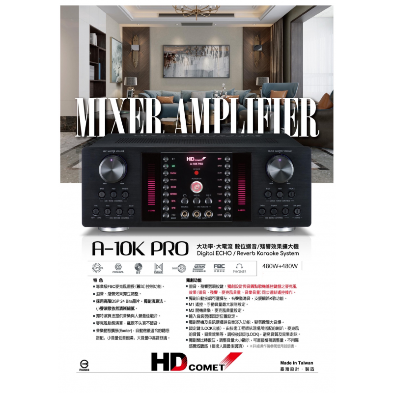 HD COMET A-10K PRO 是一款旗艦級全數位卡拉OK多功能擴大機,搭載 24bit DSP數位處理晶片,提供專業的家庭卡拉OK體驗。 產品規格根據 PChome 24h購物網站的資訊,HD COMET A-10K PRO 的主要規格包括: